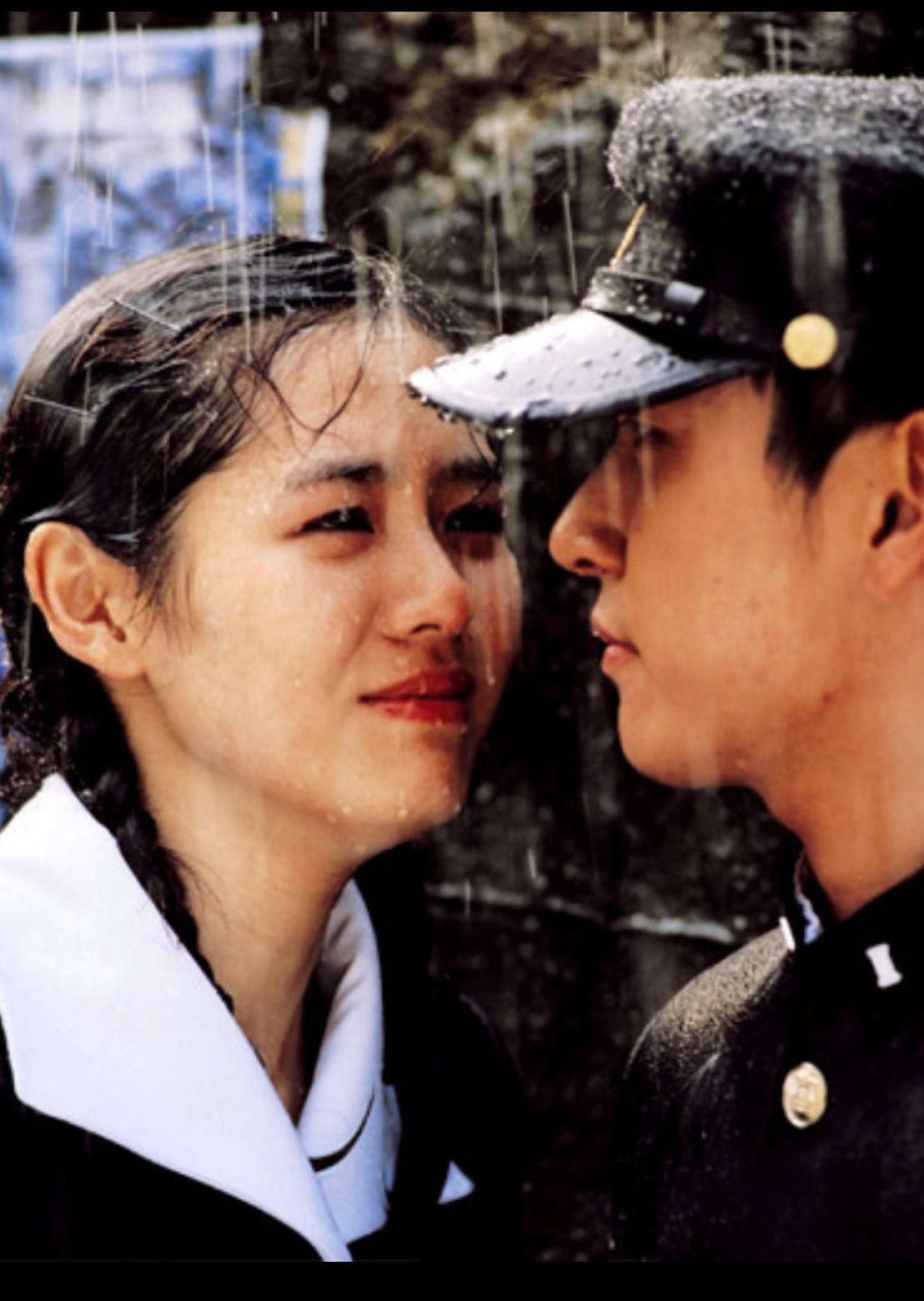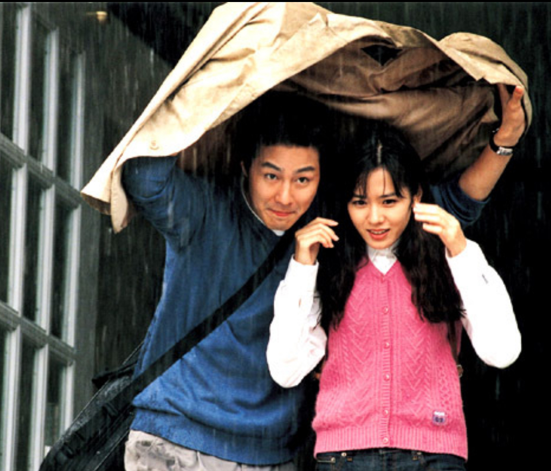 비 오는 날, 둘이 코트 하나 쓰고 함께 비를 피하는 장면은 이 영화의 상징과도 같습니다.